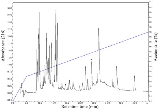 Typical chromatographic profile of the fractionation of the crude secretion of B. raniceps, using a C18 column (Shim-pack VP-ODS, no. 2122095, 4.6 mm × 150 mm, 5 µm) with a flow rate of 1 mL/min and detection at 216 nm. The fraction with antimicrobial activity that was characterized in the present study is indicated by an asterisk.