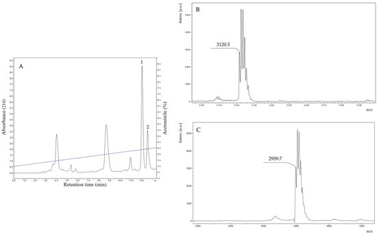 The fractions that exhibited antimicrobial activity were analyzed by MALDI-TOF mass spectrometry. The fraction indicated in Figure 2 presented in its composition two components with distinct monoisotopic molecular masses. After the rechromatographic procedure (Figure 3A), the main component exhibited a protonated monoisotopic mass [M+H]+ of 3120.5 Da (Figure 3B), and the other component with a protonated monoisotopic molecular mass [M+H]+ of 2959.7 Da (Figure 3C).