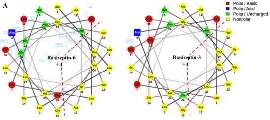 (A). Schiffer–Edmundson helical projections made using NetWheels of the antimicrobial peptides Raniseptins-3 and -6, highlighting the hydrophobic face of both peptides. (B). Secondary structure models for Raniseptins-3 and -6 using the I-TASSER server. In blue, the most electronegative region (N-terminal) can be observed, and in red, the electropositive region (C-terminal) can be observed.