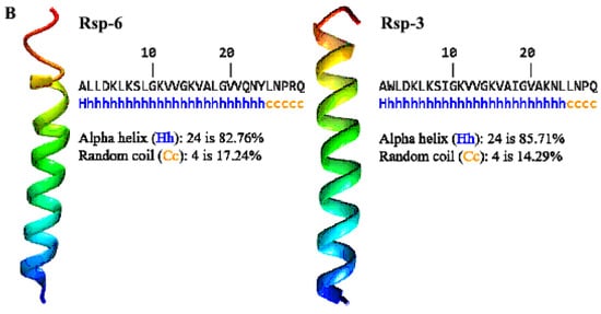 These two Raniseptins were previously identified in a cDNA library constructed with B. raniceps skin []. Magalhães et al. described nine different Raniseptins, with five belonging to the A family with the N-terminal portion starting with AWL and four belonging to the B family with the N-terminal portion starting with ALL [,]. In the case of the Raniseptins isolated here, Rsp-3 belongs to family A and Rsp-6 belongs to family B.