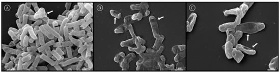 The effect of Rsp-3 and -6 on the cell membrane of E. coli (ATCC 25922) was examined using Scanning Electron Microscopy (SEM). The grooves observed on the surface of the control group represent the effect of the fixation process and dehydration of the bacterial membrane (Figure 7A, indicated by a white arrow); however, it is possible to observe the presence of intact bacteria with a normal shape and smooth surface without any defects (Figure 7A, indicated by a black arrow). In the treated groups, various alterations in the cellular shape and surface of the bacteria were observed. The bacterial cells exhibited roughening surfaces and crimpled morphologies with pores on the cell surface (Figure 7B,C).