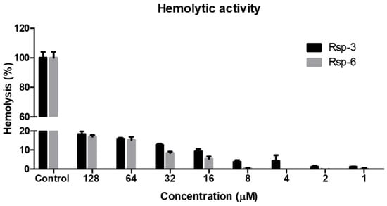 The peptides exhibited dose-dependent hemolytic behavior and even at the highest concentration used (128 μM), the hemolytic activity detected was below 20%. Furthermore, at the concentration range in which the antimicrobial activity proved to be relevant (between 2 and 8 μM), hemolysis was below 5% (Figure 8).