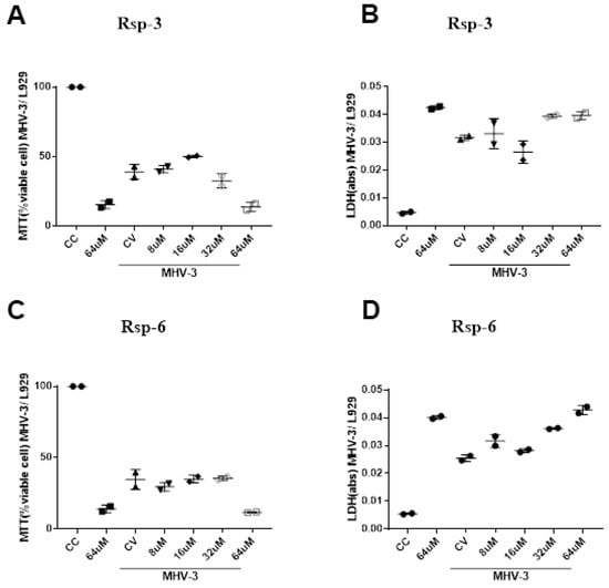 Biological effects of Raniseptins-3 and -6 on MHV-3-infected (L929) cells. Cell viability assessed by MTT assay ((A), Rsp-3 and (C), Rsp-6) and by LDH assay ((B), Rsp-3 and (D), Rsp-6).