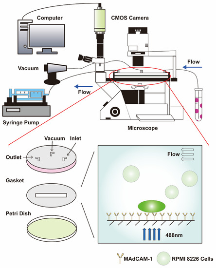 For the specific adhesion assay, a CMOS camera (Nikon) (Nikon Corporation, Tokyo, Japan) was used to record the adhesion behavior at a frame frequency of 50 fps and an objective magnification of 10× (Figure 1). A firmly adhering cell was defined as a cell in which the travel displacement during 1 min was less than 10 μm. The number of firmly adhering cells within 7 min was estimated using Image-Pro Plus (version 6.0).