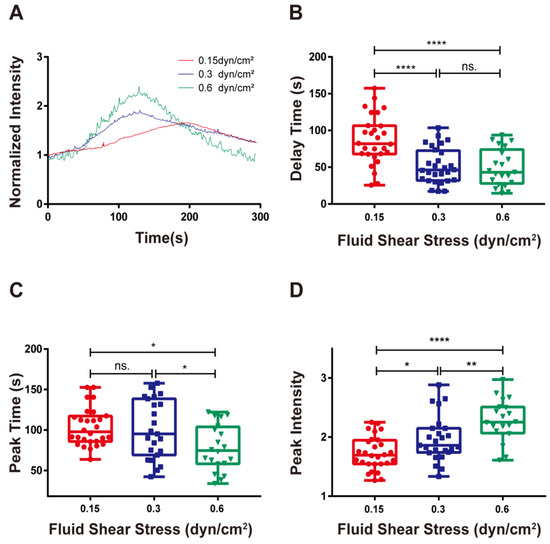 Force-regulated calcium signaling of firmly adhered RPMI 8226 cells. (A) Time course, (B) delay time, (C) peak time, and (D) peak intensity of calcium signaling for firmly adhered RPMI 8226 cells on the substrate coated with 10 μg/mL MAdCAM-1 under shear stresses of 0.15, 0.30, and 0.60 dyn/cm2. Data of each group were shown by boxplot with raw data point, where each horizontal line from top to bottom of a boxplot represents the maximum, upper quartile, median, lower quartile, and minimum for the group, respectively. At least 15 typical calcium signaling events of the firmly adhering cells should be collected among three repeat experiments for each group. Significant differences from the blank substrate group are shown by p-value, with ns. for p > 0.05, * for p < 0.05, ** for p < 0.01, and **** for p < 0.0001.