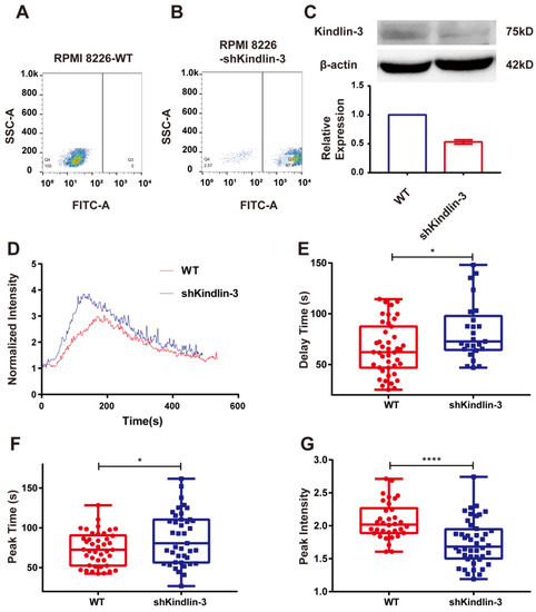 Kindlin-3 is an important adaptor in integrin signal transduction. However, the mechanism by which Kindlin-3 assists integrin α4β7 to activate cytosolic calcium bursting remains unclear. To determine whether Kindlin-3 participates in the process of calcium signaling activated by integrin α4β7, we knocked down the expression of Kindlin-3 in RPMI 8226 and examined the calcium signaling induced by the interaction of integrin α4β7 and MAdCAM-1 under flow. The positive fraction of RPMI 8226 cells silenced by Kindlin-3 shRNA in the stably transfected cell lines was found to be >90%, as detected by flow cytometry after screening with puromycin (Figure 6A,B). At the same time, the immunoblotting of total lysates of RPMI 8226 cells with stable transfection of Kindlin-3 shRNA revealed a lower expression of Kindlin-3 compared with non-transfected RPMI 8226 cells (Figure 6C). The typical time course of Kindlin-3 knockdown cells showed a significant weakening of calcium signaling (Figure 6D). When compared to the control group, the knockdown of Kindlin-3 significantly lengthened the delay and peak times while weakening the peak intensity of calcium signaling in RPMI 8226 cells (Figure 6E–G), suggesting that the blockage of Kindlin-3 could disturb calcium bursting triggered by the interaction of integrin α4β7 and MAdCAM-1. Taken together, these results indicate that Kindlin-3 is involved in calcium signaling induced by the interaction between integrin α4β7 and MAdCAM-1.
