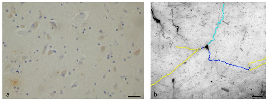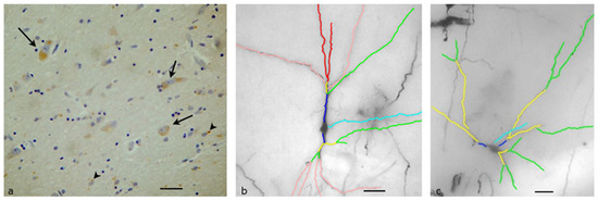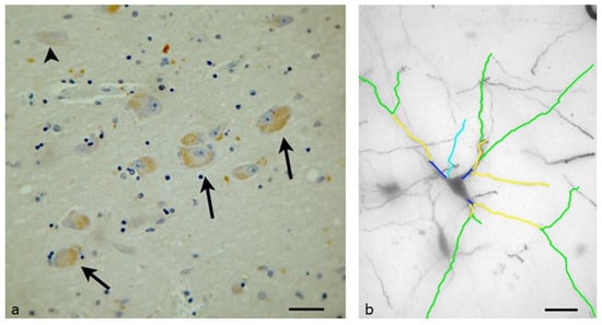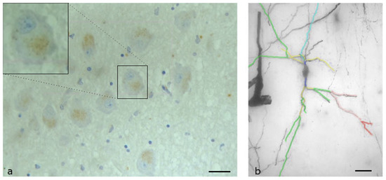 Ventromedial nucleus of the human Hypothalamus: (a) Immunohistochemical staining, specific for OX1R. More than 70% of both types of neurons were immunopositive in OX1R, but the stain was less intense for the smaller neurons (Scale bar, 30 μm); (b) A Golgi-stained neuron of the compact compartment, mapped by the ImageJ program. Only primary (dark blue) and secondary (yellow) dendrites can be found. Light blue depicts the axon of the neuron (Scale bar, 20 μm).