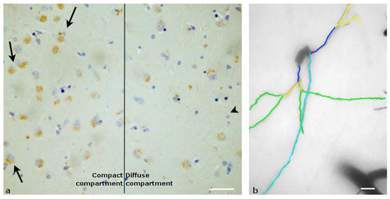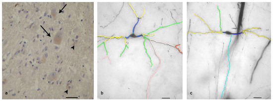 Dorsomedial nucleus of the human Hypothalamus: (a) Immunohistochemical staining, specific for OX1R. On the left of the photo is the compact compartment, with large neurons that are immunopositive (black arrow), and on the right of the photo is the diffuse compartment, with mainly smaller, non-immunopositive neurons (arrowhead) (Scale bar, 50 μm); (b) A Golgi-stained neuron of the compact compartment mapped by the ImageJ program. Primary (dark blue), secondary (yellow) and tertiary (green) dendrites can be found. Light blue depicts the axon of the neuron, which moves towards the lateral hypothalamic area (Scale bar, 10 μm).