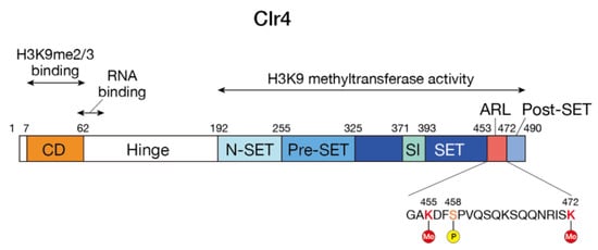 - Iglesias, N.; Currie, M.A.; Jih, G.; Paulo, J.A.; Siuti, N.; Kalocsay, M.; Gygi, S.P.; Moazed, D. Automethylation-induced conformational switch in Clr4 (Suv39h) maintains epigenetic stability. Nature 2018, 560, 504–508. [Google Scholar] [CrossRef] [PubMed]