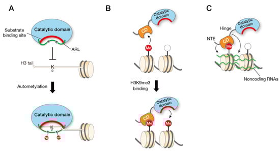 - Chin, H.G.; Esteve, P.O.; Pradhan, M.; Benner, J.; Patnaik, D.; Carey, M.F.; Pradhan, S. Automethylation of G9a and its implication in wider substrate specificity and HP1 binding. Nucleic Acids Res. 2007, 35, 7313–7323. [Google Scholar] [CrossRef]