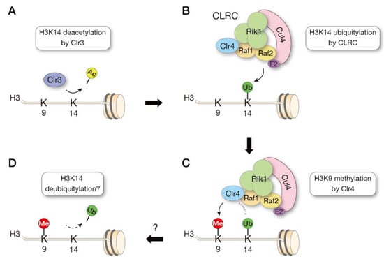 - Oya, E.; Nakagawa, R.; Yoshimura, Y.; Tanaka, M.; Nishibuchi, G.; Machida, S.; Shirai, A.; Ekwall, K.; Kurumizaka, H.; Tagami, H.; et al. H3K14 ubiquitylation promotes H3K9 methylation for heterochromatin assembly. EMBO Rep. 2019, 20, e48111. [Google Scholar] [CrossRef] [PubMed]