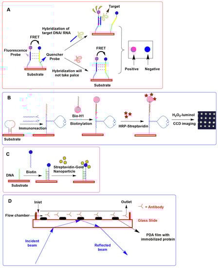 SPR, RIfS, and OIRD are some of the label-free detection methods. The major advantage of these methods is their ability to acquire real-time biomolecular interactions and to perform high-throughput analyses. For example, SPR and RIfS measure thin film’s optical dielectric response resulting due to changes in the physical or chemical properties of a biomolecular interaction. OIRD is a highly sensitive detection system that measures the reflectivity difference between S- and P-polarization during a biomolecular interaction (Figure 2D). Zhong et al. [67] coated a PDA film on a glass surface with a thickness of 90.2 nm to enhance the sensitivity of a protein microarray during an OIRD analysis. The sensitivity of the array was enhanced by two orders of magnitude in comparison to the silane-coated glass slide. In the case of a DNA microarray [77], an LED based interferometric reflectance imaging sensor (IRIS) was used to study whether the immobilization of probes was successful or not. IRISs provide real-time information on the change in mass on the probing surface. During the surface plasmon resonance imagining of a DNA microarray [53], the use of a ruthenium (III) hexamine complex (RuHex) enhanced the overall refractive index. This is because RuHex, with its small size, accessed the inaccessible DNA layers within the microarray.
