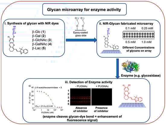Glycosidase enzyme (β-glucosidase from almonds, β-galactosidase from A. oryzae, and β-N-acetylhexosaminidase from S. pneumoniae) activities were studied using a carbohydrate microarray (Figure 4) comprised of a series of different glycosylated near-infrared probes (five probes and five carbohydrates) [62]. These arrays were also explored to estimate the IC50 values of glycosidase enzyme inhibitors (CBE, DGJ, and PUGNAc).