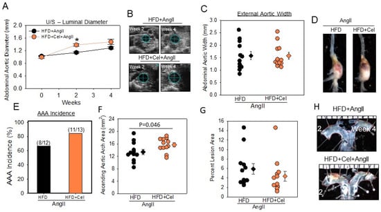 (A) Abdominal aortic luminal diameters were measured by ultrasound on weeks 0, 2, and 4 of AngII (1000 ng/kg/min) infusion in male mice (AngII + HFD n = 12; AngII + HFD + Cel n = 13). (B) Ultrasound pictographs of suprarenal aortas of individual mice at weeks 2 and 4 nearest to the mean of the group. (C) Measurements of maximal external width of abdominal aortas (AngII + HFD n = 12; AngII + HFD + Cel n = 13). Black (AngII + HFD) and orange (AngII + HFD + Cel) circles represent individual mice, diamonds represent means, and bars are SEMs. * Denotes p < 0.001 when comparing AngII + HFD vs. AngII + HFD + Cel (Student’s t test). (D) Representative images of abdominal aortas nearest the mean of each group. (E) The incidence of AAA in AngII-infused HFD (black bar) or HFD + Cel (orange bar) supplemented groups of mice. Statistical analyses were performed by Fisher’s exact test. (F) Area of ascending aortic arch and atherosclerotic lesion area (G) was measured on the intimal surface of the aortic arch. p = 0.046 when comparing AngII + HFD vs. AngII + HFD + Cel (Student’s t test). (H) Representative images of ascending aortas nearest the mean of each group. AngII: angiotensin II, HFD: high-fat diet, Cel: Celastrol.