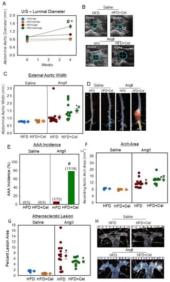 (A) Abdominal aortic luminal diameters were measured by ultrasound on weeks 0 and 4 of saline or AngII (500 ng/kg/min) infusion in male mice (saline n = 5; AngII n = 11). Purple (saline + HFD), teal (saline + HFD + Cel), blue (AngII + HFD), and red (AngII + HFD + Cel) circles represent means, and bars are SEMs. * Denotes p < 0.05 when comparing saline vs. AngII infusion; # p < 0.05 AngII + HFD vs. AngII + HFD + Cel (two-way ANOVA repeated measures test). (B) Ultrasound pictographs of suprarenal aortas of individual mice at week 4 nearest to the mean of the group. (C) Measurements of maximal external width of abdominal aortas. * Denotes p < 0.001 saline vs. AngII infusion; # p < 0.001 AngII + HFD vs. AngII + HFD + Cel (two-way ANOVA with Holm–Sidak post hoc analysis). (D) Representative images of abdominal aortas nearest the mean of each group. (E) The incidence of AAA. # p < 0.001 AngII + HFD vs. AngII + HFD + Cel (Fisher’s exact test). (F) Area of ascending aortic arch and atherosclerotic lesion area (G) was measured on the intimal surface of the aortic arch. * Denotes p < 0.05 when comparing saline vs. AngII infusion; # p < 0.05 AngII + HFD vs. AngII + HFD + Cel (two-way ANOVA with Holm–Sidak post hoc analysis). (H) Representative images of ascending aortas nearest the mean of each group. AngII: angiotensin II, HFD: high-fat diet, Cel: Celastrol.