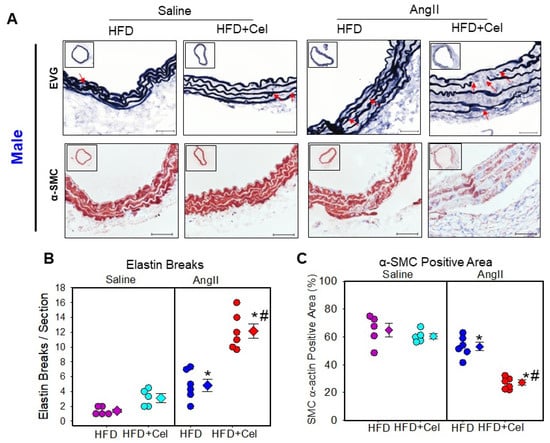 (A) Representative suprarenal aortic tissue sections from saline or Ang II (500 ng/kg/min) infused male mice supplemented with high fat diet +/- Celastrol stained with Verhoeff’s or α-SMC actin. Red arrows indicate medial breaks. Scale bars correspond to 50 μm. Measurements of aortic medial break (B) and α-SMC actin positive area (C) in the cross-sections of abdominal aortas (n = 5–6 in each group). Purple (saline + HFD), teal (saline + Cel), blue (AngII + HFD), and red (AngII + HFD + Cel) circles represent individual mice, diamonds represent means, and bars are SEMs. * Denotes p < 0.05 when comparing saline vs. AngII infusion; # p < 0.05 AngII + HFD vs. AngII + HFD + Cel (two-way ANOVA with Holm–Sidak post hoc analysis). AngII: angiotensin II, HFD: high-fat diet, Cel: Celastrol.