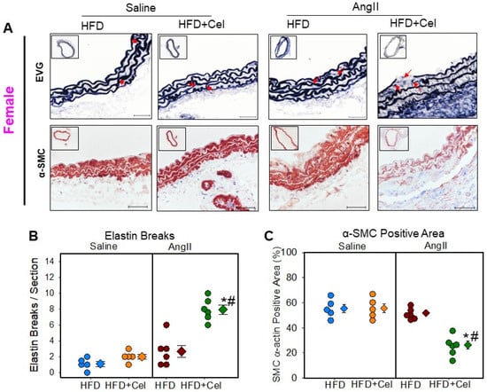 (A) Representative suprarenal aortic tissue sections from saline or Ang II (1000 ng/kg/min) infused female mice supplemented with high fat diet +/- Celastrol stained with Verhoeff’s or α-SMC actin. Red arrows indicate medial breaks. Scale bars correspond to 50 μm. Measurements of aortic medial break (B) and α-SMC actin positive area (C) in the cross-sections of abdominal aortas (n = 5–6 in each group). Blue (saline + HFD), orange (saline + Cel), brown (AngII + HFD), and green (AngII + HFD + Cel) circles represent individual mice, diamonds represent means, and bars are SEMs. * Denotes p < 0.05 when comparing saline vs. AngII infusion; # p < 0.05 AngII + HFD vs. AngII + HFD + Cel (two-way ANOVA with Holm–Sidak post hoc analysis). AngII: angiotensin II, HFD: high-fat diet, Cel: Celastrol.