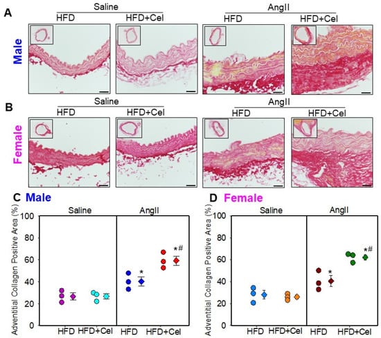 Representative suprarenal aortic tissue sections from saline or Ang II (500 or 1000 ng/kg/min) infused male (A) and female (B) mice supplemented with high fat diet +/- Celastrol stained with Picrosirius red stain. Scale bars correspond to 50 μm. Measurements of adventitial collagen positive area (Male—(C); Female—(D)) in the cross-sections of abdominal aortas (n = 3 in each group). Male—purple (saline + HFD), teal (saline + Cel), blue (AngII + HFD), and red (AngII + HFD + Cel) and Female—blue (saline + HFD), orange (saline + Cel), brown (AngII + HFD), and green (AngII + HFD+ Cel) circles represent individual mice, diamonds represent means, and bars are SEMs. * Denotes p < 0.05 when comparing saline vs. AngII infusion; # p < 0.05 AngII + HFD vs. AngII + HFD + Cel (two-way ANOVA with Holm–Sidak post hoc analysis). AngII: angiotensin II, HFD: high-fat diet, Cel: Celastrol.