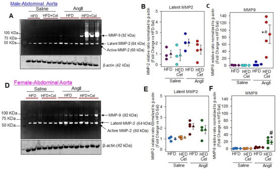 Gelatin zymography detected MMP-2, -9 in abdominal aortas from saline and AngII-infused male (A) and female (D) mice supplemented with a high-fat diet +/- Celastrol. Measurements of the relative ratio of MMPs in male (B,C) and female (E,F) normalized to loading control β-actin protein (n = 4). Circles represent individual mice, diamonds represent means, and bars are SEMs. * Denotes p < 0.05 when comparing saline vs. AngII infusion; # p < 0.05 AngII + HFD vs. AngII + HFD + Cel (two-way ANOVA with Holm–Sidak post hoc analysis). AngII: angiotensin II, HFD: high-fat diet, Cel: Celastrol.