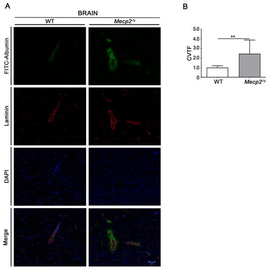 In this study, we provide the first evidence of perturbed BBB integrity in one of the most-used Mecp2-/y RTT mouse models. The extravasation of FITC-albumin, observed in the brain parenchyma of Mecp2-/y mice, is indicative of the BBB breakdown in RTT syndrome (Figure 6), which ultimately results in increased vascular permeability.