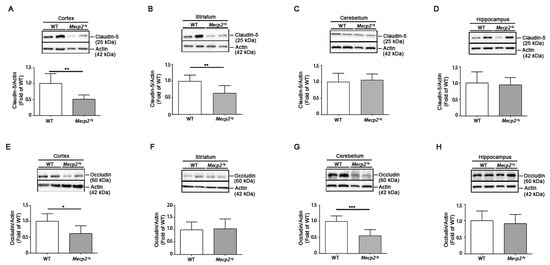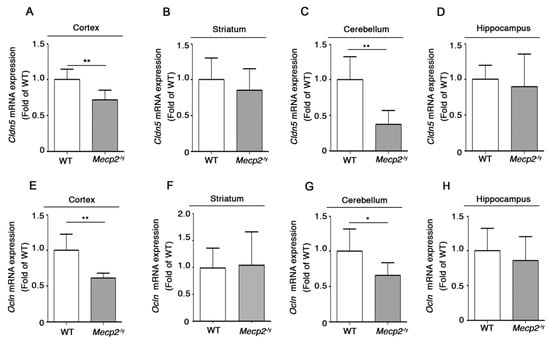 Alterations in the expression of TJ proteins, claudin-5 and occludin, are associated with an aberrant BBB permeability [45]. Thus, we investigated the expression of claudin-5 and occludin in different brain areas of symptomatic Mecp2-/y mice in comparison with age-matched WT controls. While the expression of claudin-5 was significantly decreased in the cortex and the striatum (Figure 2A,B) of RTT mice, occludin was reduced in the cortex and the cerebellum (Figure 2E,G). No difference in the expression of either proteins was observed in the hippocampus (Figure 2D,H).