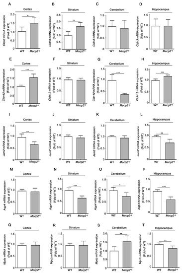The qPCR analysis revealed that each gene displayed a characteristic expression profile depending on the brain region analyzed. The expression of Cldn3 was significantly higher in the cortex and the striatum of symptomatic Mecp2-/y in comparison with WT mice (Figure 4A,B), whereas its levels were unchanged in the cerebellum and the hippocampus (Figure 4C,D).