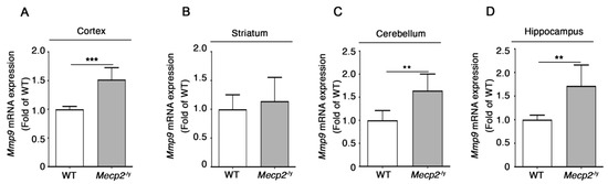 Mmp9 mRNA levels were increased in the cortex, the cerebellum, and the hippocampus of symptomatic Mecp2-/y mice with respect to the WT controls (Figure 5A,C,D), whereas no differences in Mmp9 transcript levels were detected in the striatum of the same mice (Figure 5B).