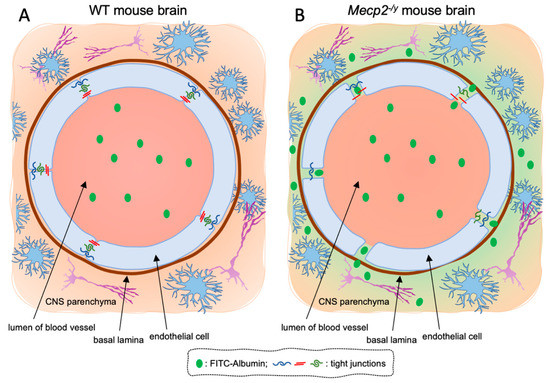 Schematic representation of the blood–brain barrier in WT and Mecp2-/y mice. (A) In WT brain, the tracer FITC-albumin is retained within the lumen of blood vessels due to the integrity of the TJs between the endothelial cells in the brain parenchyma. (B) In Mecp2-/y brain, an increased permeability of the BBB, visible as a diffusion of FITC-albumin along perivascular spaces and brain parenchyma, occurs (likely due to disruption of the TJs).