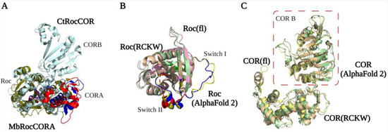 RocCOR tandem structures. (A) Alignment of the Mb (PDB ID: 4WNR) and Ct (PDB ID: 3DPU) RocCOR domains in dark green and light blue respectively. The rearrangement of P-loop, switch II, and CORA domain are indicated in red (MbRocCORA) and blue (CtRocCOR). (B,C) Alignment of the Roc/COR domain from LRRK2RCKW (PDB ID: 6VP7) (light yellow), flLRRK2 (PDB ID: 7LHW) (pink), and AlphaFold2 (green). The partly and totally missed switch I/II in LRRK2RCKW are highlighted in blue (flLRRK2), red (LRRK2RCKW), and yellow (AlphaFold2), respectively.