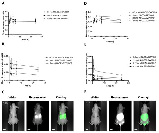 Left panel: Average tumor-to-background ratios (A), mean fluorescence intensities in the tumor (B), and representative images of the optimal doses based on the TBR acquired by the Pearl Imager (C) for NbCEA5-ZW800F. Right panel: Average tumor-to-background ratios (D), mean fluorescence intensities in the tumor (E), and representative images of the optimal doses based on the TBR acquired by the Pearl Imager (F) for NbCEA5-ZW800-1. Scale bars are 10 mm. Abbreviations: T = tumor; Ki = kidneys.