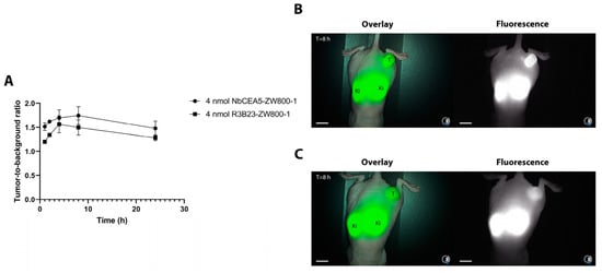 Comparison of tumor-to-background ratios over time for both NbCEA5-ZW800-1 and NbR3B23-ZW800-1 (control Nanobody) (A). Representative fluorescence overlay image acquired by the Quest Imaging system for NbCEA5-ZW800-1 (B) and NbR3B23-ZW800-1 (C) at the optimal imaging time point (8 h). Scale bars are 10 mm. Abbreviations: T = tumor; Ki = kidneys.