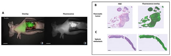 Fluorescence overlay image of an orthotopic implanted pancreatic tumor model including splenic metastases 2 h after injection of 4 nmol NbCEA5-ZW800-1 (A). Scale bars are 10 mm. Note: the kidneys were removed. The presence of tumor cells was histologically confirmed in (B,C). Scale bars are 1000 µm. Abbreviations: T = tumor; Sp: spleen; M = metastasis; P = normal pancreas.