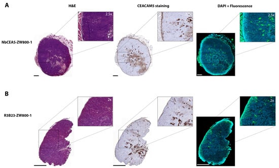 Representative examples of hematoxylin-eosin (HE) staining, CEACAM5 staining, and combined DAPI staining with NIR fluorescence (800 nm) on ex vivo tumor tissue sections of mice injected with NbCEA5-ZW800-1. (A) Representative examples of hematoxylin-eosin (HE) staining, CEACAM5 staining, and combined DAPI staining with NIR fluorescence (800 nm) on ex vivo tumor tissue sections of mice injected with NbR3B23-ZW800-1. (B). Scale bars are 1000 µm.