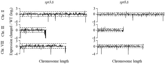 Spt3 and Spt8 regulate subtelomere gene expression. Changes in expression of genes from Chr II, III, and VIII in the spt3Δ and spt8Δ and the wild type (WT) strains as determined by microarray. Dotted lines show the average ± 2· standard deviation.