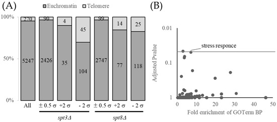 To confirm that Spt3 and Spt8 affect subtelomeric region dominance, we analyzed trends in genes with fluctuating expression levels, focusing on their distance from telomeres. We checked the position of the genes at the chromosomes and found that 270 genes of all yeast genes (5517 genes) were located within 30 Kb from telomeres (subtelomeres), and the frequency rate of subtelomere genes was approximately 5% (270/5517). If the effects of Spt3 and Spt8 occur randomly throughout the genome, we considered that the frequency rate of affected genes in subtelomeres is about 5% in spt3Δ or spt8Δ compared with WT. In the spt3Δ compared with WT, there were 149 genes downregulated by a less than two-fold standard deviation (−2σ, 0.46-fold), of which 46 genes were located in the subtelomere, and the frequency rate was approximately 30% (46/149) (Figure 2A, left; p = 3.9 × 10−9, Fisher’s test). Similarly, in the spt8Δ, 143 genes were downregulated by <−2σ (0.59-fold) and 25 genes were located in the subtelomere. From this, the frequency rate was approximately 17% (25/143) (Figure 2A, right; p = 1.1 × 10−3). Furthermore, gene ontology analysis of the downregulated genes in spt3Δ showed enrichment of genes involved in the stress response (Figure 2B). This is consistent with previous reports showing that, among TBP target genes, SAGA-dominated genes are involved in the stress response [32], and that many stress response genes are contained in subtelomeric region [47,48]. These results indicate that the genes regulated by the SAGA-TBP interaction are strongly enriched in subtelomeric regions.