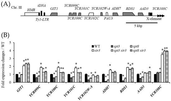 Spt3 and Spt8 are involved in boundary formation. (A) Gene map of Chr IIIR. Grey genes were measured gene expression. (B) Transcription level at Chr IIIR genes in the spt3Δ strain and spt8Δ strain, and in the sir3Δ strain by RT-qPCR. Asterisks mean p < 0.05 compared with WT (Student’s t-test). Error bars show standard errors calculated from three independent experiments.