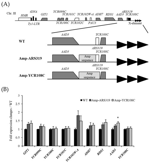 Therefore, we hypothesized that a DNA sequence-dependent silencing boundary exists between YCR108C and AAD3. To test this hypothesis, we generated a yeast strain in which the region between AAD3 and YCR108C was replaced by an ampicillin resistance (ampR) gene sequence, which is normally not present in yeast. Considering the possibility that the ARS319 sequence between AAD3 and YCR108C may affect boundary formation, we generated the Amp-ARS319 strain, which replaced the region from AAD3 to ARS319, and the Amp-YCR108C strain, which replaced the region from AAD3 to YCR108C (Figure 4A), and performed RT-qPCR at the Chr IIIR. Contrary to expectations, insertion of the ampR gene sequence into the intergenic region (Amp-ARS319 and Amp-YCR108C) did not affect gene expression within the Chr IIIR, indicating that the regulation of the silencing region by boundary formation is independent of the DNA sequence between AAD3 and YCR108C at Chr IIIR (Figure 4B).