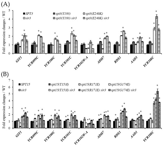We investigated the effect of two previously identified mutations in the SPT3 gene that affect the interaction of Spt3 with TBP on gene transcript levels at Chr IIIR. The first Spt3 (Y193C) mutant strain (spt3(Y193C)) produces Spt3 with a Y193C amino acid residue substitution that attenuates the interaction with TBP. Conversely, the second Spt3 (E240K) mutant strain (spt3(E240K)) has Spt3 with an E240K substitution resulting in a stronger interaction with TBP and reduced TBP recruitment to the TATA box [16,28,49]. Both of these substitutions affect the SAGA-TBP interaction and, like spt3Δ, are assumed to disrupt the boundary and repress gene expression at Chr IIIR. Contrary to expectations, spt3(Y193C) did not show a decrease in gene expression (Figure 5A). In addition, deletion of the SIR3 gene in the spt3(Y193C) strain (spt3(Y193C) sir3Δ) resulted in slightly higher expression levels of some genes than in the sir3Δ strain. Transcription of some genes was downregulated in spt3(E240K), as well as gene transcription levels in the spt3(E240K) sir3Δ, in contrast to spt3(Y193C). These results indicated that in some genes at Chr IIIR, the effects of Y193C and the E240K substitutions in Spt3 were dependent on the presence of Sir3 protein.