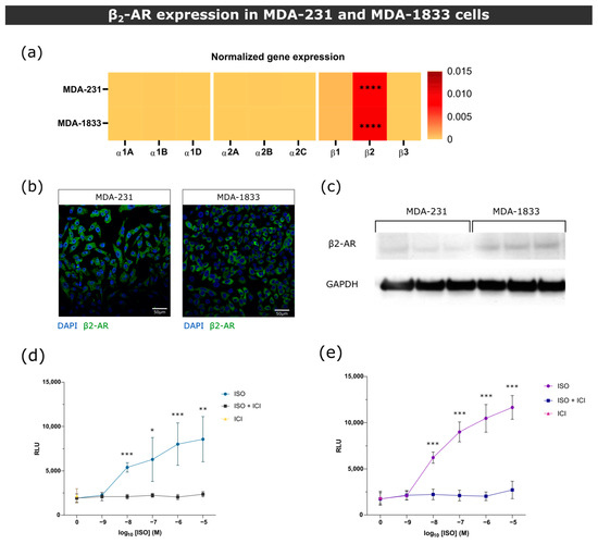 β2-AR gene and protein expression in MDA-231 and MDA-1833 cells. (a) Normalized gene expression of ARs in primary MDA-231 and metastatic MDA-1833 cell lines performed by real time PCR. One-way ANOVA with Holm–Šídák’s multiple comparison test was used to compare β2-AR expression to every other ARs in MDA-231 or MDA-1833 (n = 6, **** p < 0.0001). No significant differences were found in AR expression between MDA-231 and MDA-1833 cells (two-way ANOVA with Šídák’s multiple comparison test). (b) Representative micrograph of the expression of β2-AR on MDA-231 cells (left) and MDA-1833 cells (right) by immunocytochemistry. Nuclei—blue; β2-AR—green. Scale bar—50 μM. (c) Expression of β2-AR on MDA-231 and MDA-1833 cells by Western blot. Uncropped blot can be found in Figure S4. (d) Stimulation of MDA-231 or (e) MDA-1833 cells with ISO results in cAMP accumulation, which is abrogated by the incubation with 1 μM ICI. Data were generated from three experiments performed in triplicate (Mann–Whitney test, * p < 0.05, ** p < 0.01, *** p < 0.001).