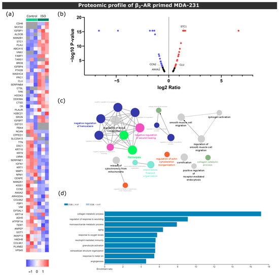 Proteomic screening of MDA-231 conditioned media under β2-AR activation. (a) Heatmap depiction of significantly deregulated proteins found in conditioned medium from control or ISO-treated MDA-231 cells (Student’s t-test, p ≤ 0.05). The ratio of protein abundances was color coded as shown in the legend. Data from three independent samples are shown, one sample per column. Gray cells represent proteins not detected in a particular sample. (b) Volcano plot distribution of significantly deregulated proteins. The ratio between protein abundances between MDA-231 cells treated with ISO and control samples are plotted on the X axis, and the p-value is plotted on the Y axis. Red dots represent proteins with a fold change ≥ 1.5, while purple dots represent proteins with a fold change ≤ −1.5. (c) Gene ontology biological process network analysis of differentially expressed proteins in ISO-treated MDA-231 cells. Only networks with p ≤ 0.05 are shown (two-sided hypergeometric test and Bonferroni step-down correction). Different colors illustrate different biological processes, while the size of the nodes is proportional to the statistical significance of each process. (d) Significantly enriched biological process terms in the group of deregulated proteins in ISO-treated MDA-231 cells. ORA was used and only processes with a false discovery rate of ≤0.05 are shown.