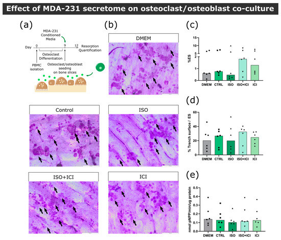 In the bone microenvironment, osteoclasts receive input from neighboring osteoblasts that promote osteoclast differentiation and activation. Aiming to replicate this interaction, a co-culture of mature human osteoclasts and human osteoblasts was established. Osteoblasts were positive for the osteoblast marker alkaline phosphatase (ALP) and several calcium deposits were observed by alizarin red staining after 14 days of culture (Figure S6). We confirmed that these cells expressed RANKL at their cellular membrane and were able to increase osteoclast resorption activity in several independent experiments (Figure S6). Osteoclast and osteoblast co-cultures were exposed to the secretome from ISO-treated MDA-231 cells and bone resorption activity was evaluated (Figure 4a). Contrarily to what was observed in osteoclast monocultures, no statistically significant differences were observed between conditions in total resorption activity (Figure 4b,c), trench percentage (Figure 4d) or TRAcP activity (Figure 4e). Therefore, our results suggest that osteoblast-derived factors in the co-culture model rescued the resorption activity of osteoclasts.