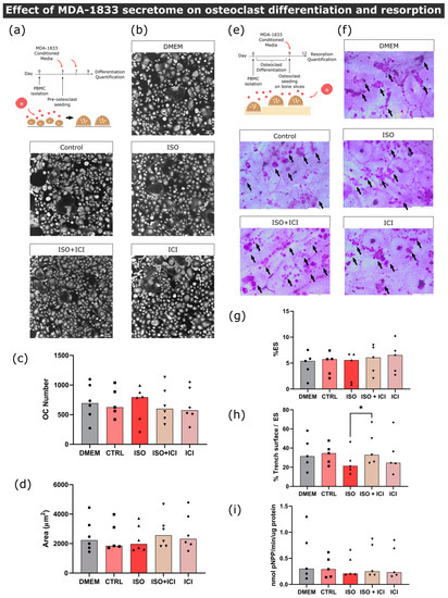 Following the same reasoning as that of the MDA-231 secretome experiments, we proceeded to quantify mature osteoclast resorption activity under the effects of MDA-1833 secretome instead (Figure 5e). No differences were observed in the percentage of eroded surface when comparing the effects of ISO-treated MDA-1833 secretome with their respective controls (Figure 5f,g). However, ISO-treated MDA-1833 secretome significantly blunted the ability of osteoclasts to resorb in trench mode in a β2-AR-dependent fashion (36% reduction, Figure 5h). Nonetheless, this was not due to changes in osteoclastic TRAcP activity, since no significant differences were found between conditions (Figure 5i).