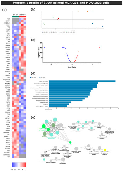 β2-AR signaling leads to different outcomes in parental MDA-231 or bone tropic MDA-1833 cells. (a) Heatmap depiction of significantly deregulated proteins found in conditioned medium from control or ISO-treated MDA-231 and MDA-1833 cells (Student’s t-test, p ≤ 0.05). The ratio of protein abundances was color coded as shown in the legend. Data from three independent samples are shown, one sample per column. Gray cells represent proteins not detected in a particular sample. (b) PCA of deregulated proteins between MDA-231 and MDA-1833, both in the control and ISO-treated conditions. (c) Volcano plot distribution of significantly deregulated proteins in ISO-treated MDA-1833 and ISO-treated MDA-231 samples. The ratio between protein abundances between ISO MDA-1833 cells and ISO MDA-231 cells is plotted on the X axis, and the p-value is plotted on the Y axis. Red dots represent proteins with a fold change ≤ 1.5, while purple dots represent proteins represent proteins with a fold change ≤ −1.5. (d) Significantly enriched biological process terms in the group of deregulated proteins in ISO-treated MDA-1833 and ISO-treated MDA-231 cells. ORA was used and only processes with a false discovery rate of ≤ 0.05 are shown. (e) Gene ontology biological process network analysis of differentially expressed proteins in ISO-treated MDA-1833 and ISO-treated MDA-231 cells is shown. Only networks with p ≤ 0.05 are shown (two-sided hypergeometric test and Bonferroni step-down correction).
