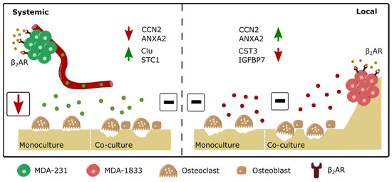Schematic depiction of the differential modulation of osteoclast resorption activity by parental or bone tropic breast cancer cells. (Left panel) β2-AR stimulation drives the upregulation of several proteins, such as Clu and STC1, and the downregulation of proteins such as CCN2 and ANXA2 in parental MDA-231 BC cells. Although exposure to the secretome of β2-AR primed parental BC cells leads to decreased osteoclast resorption activity, the addition of osteoblasts to the model rescues osteoclast activity to control levels. (Right panel) on the other hand, the β2-AR stimulation of bone tropic MDA-1833 cells leads to the upregulation of proteins such as CCN2 and ANXA2 and the downregulation of proteins such as CST3 and IGFBP7. The distinct modulation of protein expression by β2-AR on bone tropic cells did not result in observable changes in osteoclast activity, either in monocultures or in co-cultures with osteoblasts.