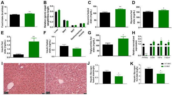 KI S273A lineage after 8 weeks of maintenance diet (MNT), since weaning, comparing with WT animals. (A) Food intake during the 8 weeks of MNT diet. (B) Relation of organ weight/tibia length on euthanasia day. Glycemia on (C) fasted and (D) fed states, on euthanasia day. Plasma insulin levels on (E) fed and (F) fasted states on euthanasia day. (G) Plasma triglycerides in fed state. (H) Relative normalized expression of PPARγ, Cd36, TNFα, and Fabp4 on liver, data were normalized to the expression of reference genes: 36b4 and Rpl27. (I) Liver representative image. (J) Hepatic glycogen in fasted and (K) fed states. Data are represented as mean ± SEM. Statistical analysis was performed using non-parametric t-test. * p < 0.05, ** p < 0.01, **** p < 0.0001. n ≥ 5 per group.
