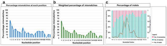 The number and position of mismatches were counted along the length of the guide RNA by implementing a Python script. The corresponding nucleotide at that position in the target sequence is simultaneously noted. The script was also employed to count the number and position of gaps in the sequences, indicating a DNA/RNA bulge, while noting the corresponding target nucleotide. The results from the script were plotted as a percentage of the total to comprehend the trends in mismatch and bulge tolerance.
