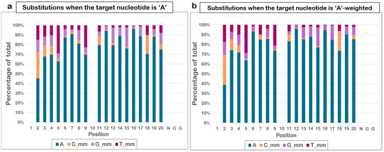 Nucleotide-specific trend in mismatch tolerance. (a) Counted for all instances when the target nucleotide is ‘A’ and (b) frequency-weighted trend for mismatch tolerance when ‘A’ is the target nucleotide, calculated individually for each position.