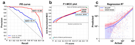 CRISP–RCNN prediction performance. (a) The precision–recall (PR) curve for CRISP–RCNN has an area under the curve (AUC) of 0.88, and performs better than the other dual-sequence-based classifier in the comparison, which has an AUC of 0.71, reported by Lin et al., 2018 [35]. (b) The F1-MCC curve indicating robust performance even on the imbalanced dataset; the points indicating the best- and worst-possible prediction performance are also highlighted. In plots (a,b), the dashed line indicates random prediction, i.e., 50% accuracy. (c) The R2 value for the CRISP–RCNN regressor is 0.71, showing better performance than a previous guide RNA prediction model built on sequence and physicochemical parameters, which shows an R2 value of 0.49 [36].