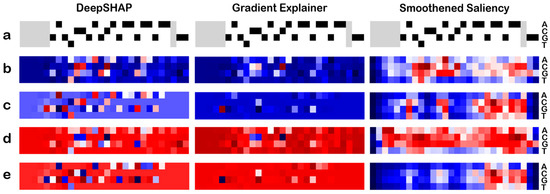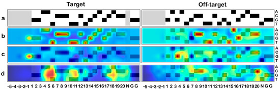 The smoothened saliency, DeepSHAP, and gradient explainer SHAP (GradExp) were employed to generate AMs of the various sequences, as detailed in Section 2. The three algorithms helped visualize the models to focus on mismatches and gaps when present. DeepSHAP and GradExp highlighted the gaps and mismatches in blue, indicating a negative impact of their presence on the model’s output decision. In case of mismatches as well as gaps, the spot of the expected nucleotide is accentuated (Figure 5). In the case of the NGG PAM, the trend observed indicates a preference against the presence of a GGG PAM, which has also been established in the literature [33].