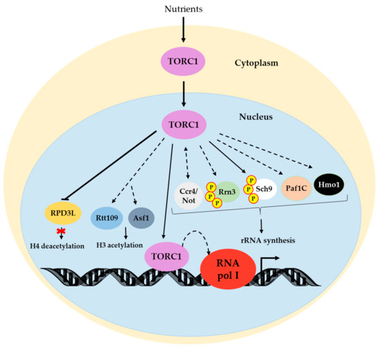 - Claypool, J.A.; French, S.L.; Johzuka, K.; Eliason, K.; Vu, L.; Dodd, J.A.; Beyer, A.L.; Nomura, M. Tor Pathway Regulates Rrn3p-dependent Recruitment of Yeast RNA Polymerase I to the Promoter but Does Not Participate in Alteration of the Number of Active Genes. Mol. Biol. Cell 2004, 15, 946–956. [Google Scholar] [CrossRef] [PubMed]